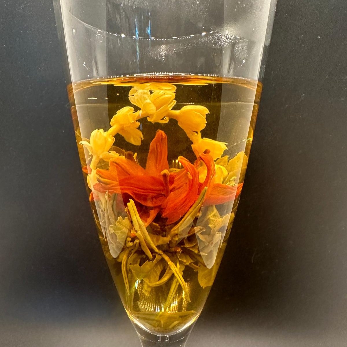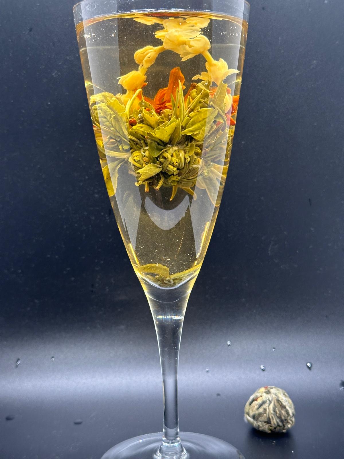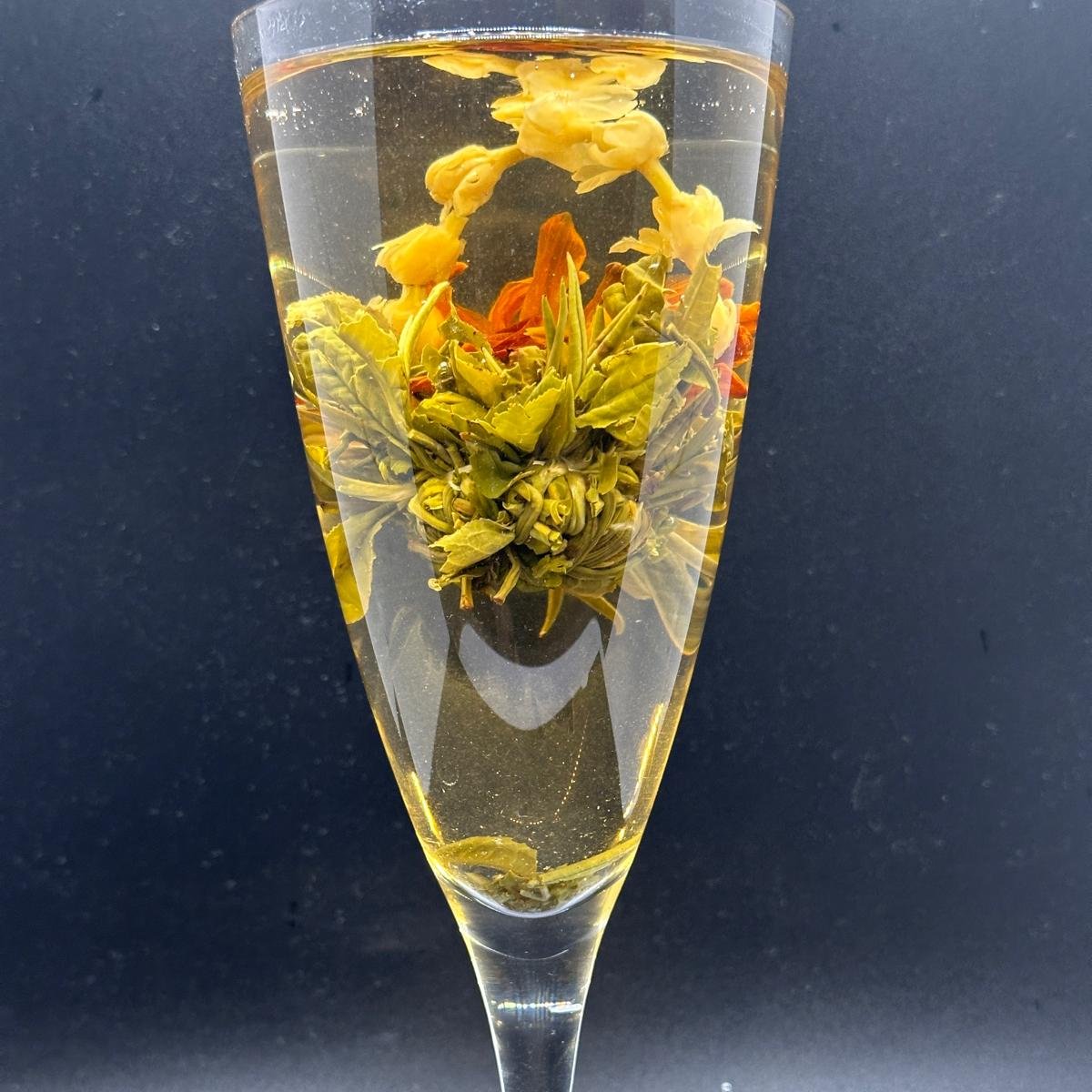 Handcrafted blooming tea. Steeped in hot water, these exclusive creations slowly blossom into a bouquet of breathtaking flavor, aroma, and visual delight. As the water hits the tea, the pod starts its life as a bouquet of blossoms. The design is wonderful, the white tea exquisite and lightly floral.
