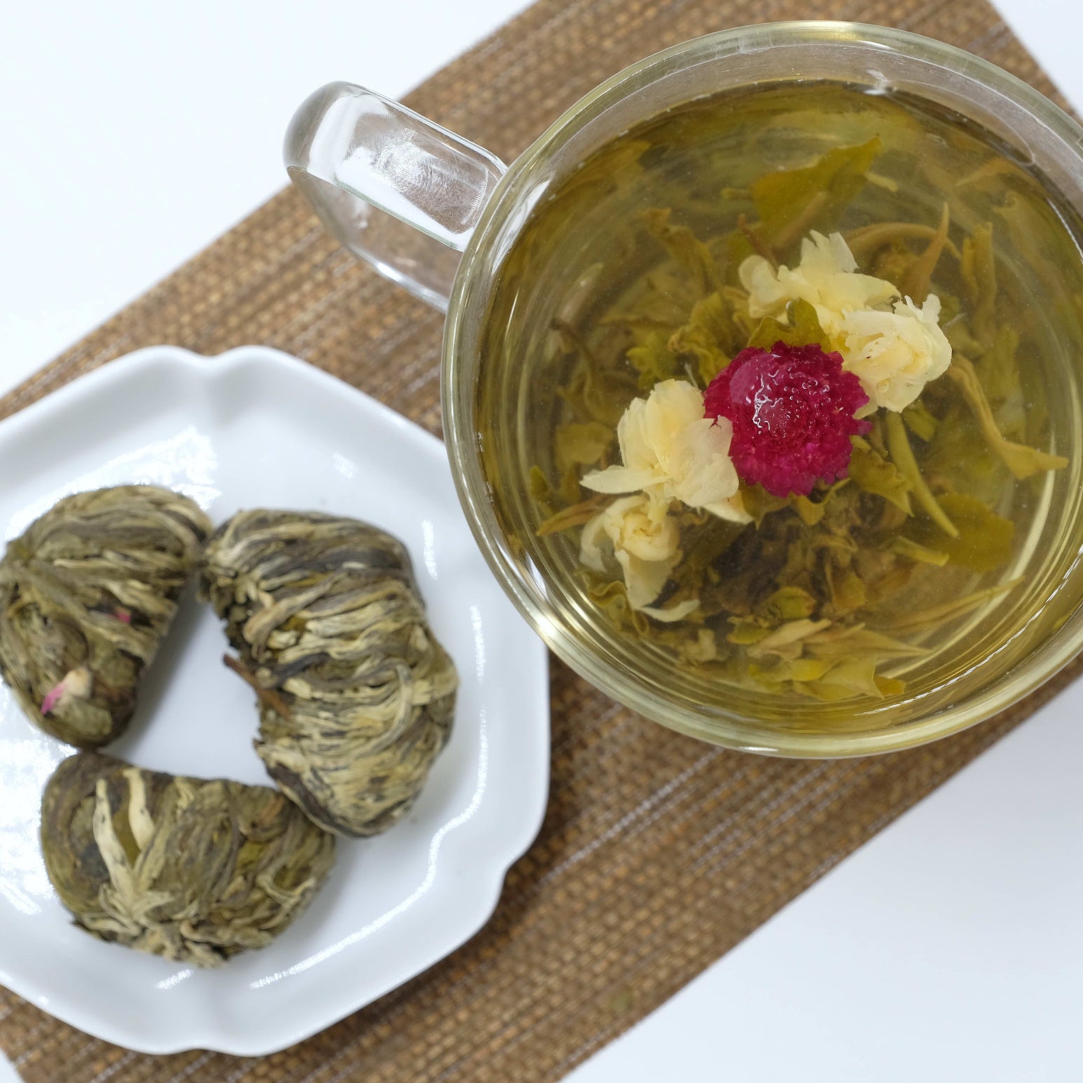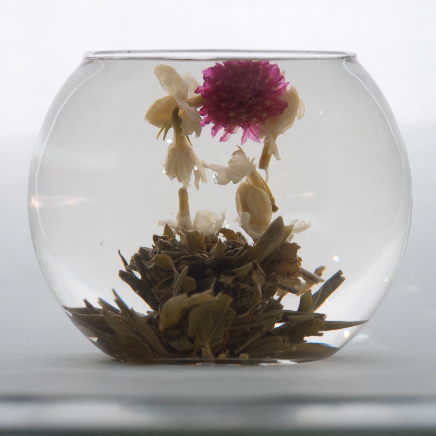 Handcrafted blooming tea. Steeped in hot water, these exclusive creations slowly blossom into a bouquet of breathtaking flavor, aroma, and visual delight. As the water hits the tea, the pod starts its life as a bouquet of blossoms. The design is wonderful, the white tea exquisite and lightly floral.